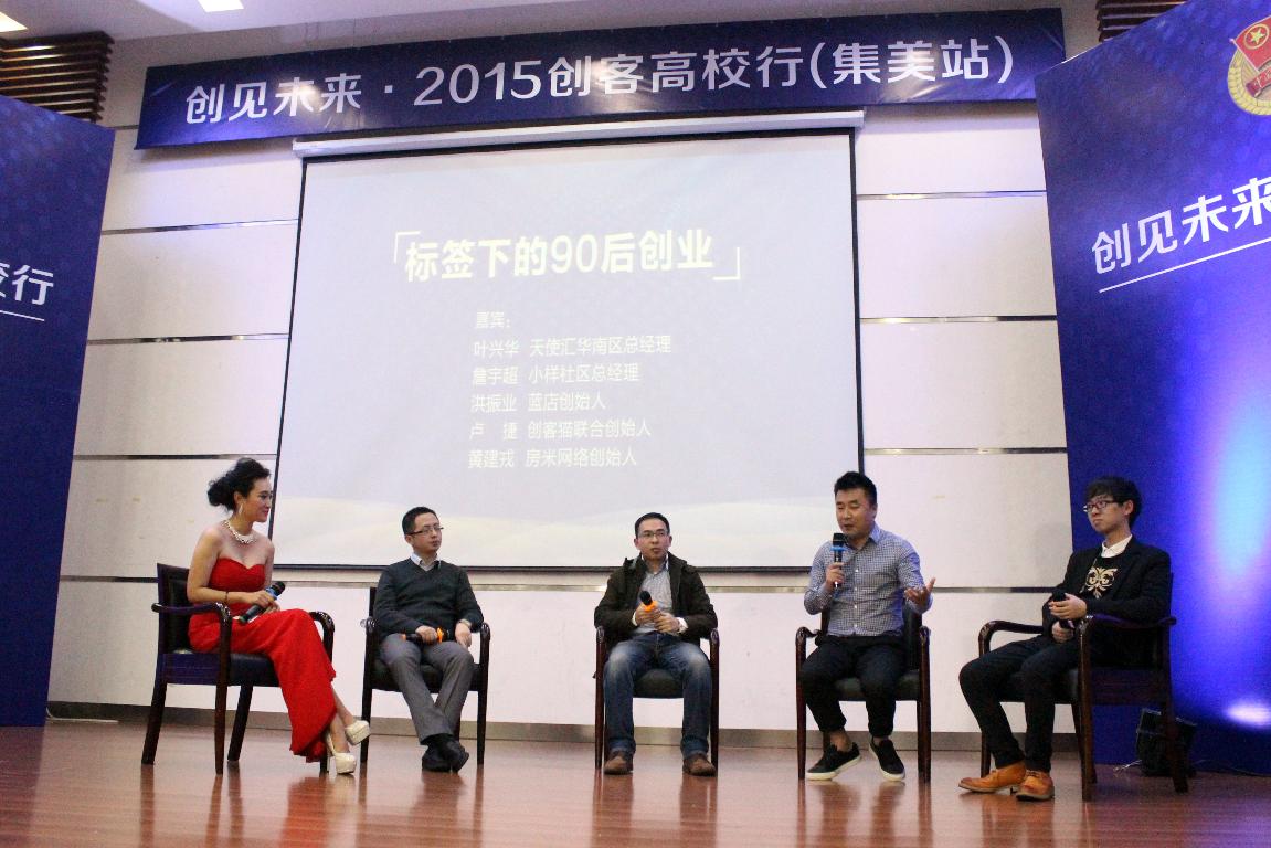 现场还进行了“标签下的90后创业”的圆桌对话。房米网络股份CEO黄建戎、天使汇华南区总经理叶兴华、创客猫联合创始人卢捷、蓝店CEO洪振业、小样社区总经理詹宇超共同对话。作为诚毅学院12级在校生,卢捷以90后的独特视角,向在场同学们分析了90后创业的利与弊。几位创业者在交流中碰撞出了思想的火花,更以冷静、客观的态度,全面分析了90后创业的形势,以期给创业的同学们带来指引与帮助。