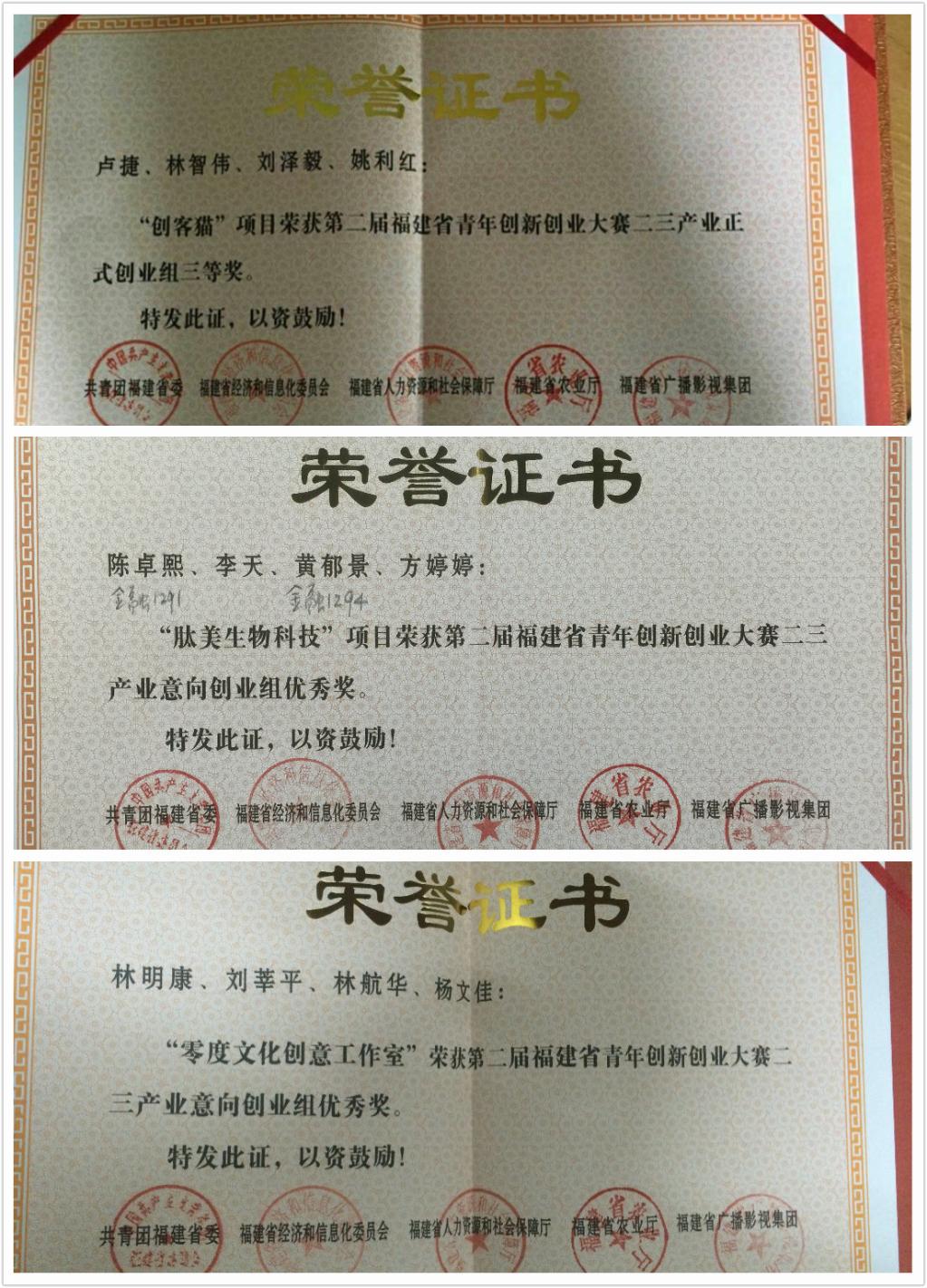 我院学生创业项目参加第二届福建省青年创新创业大赛,金融1293卢捷同学的《创客猫》公司荣获二三产业正式创业组三等奖;国贸1473林明康的《零度文化创意工作室》和金融1291陈卓熙《肽美生物科技》获二三产业意向创业组优秀奖。