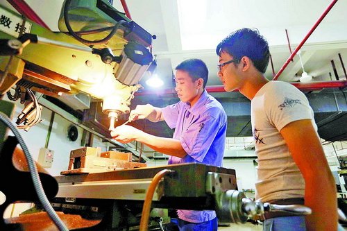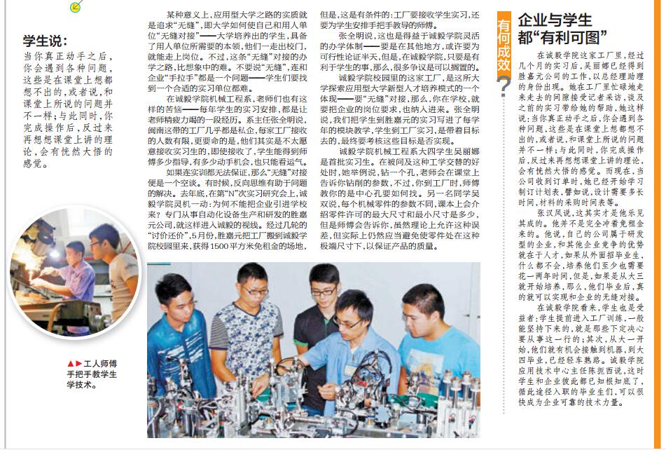 诚毅学院机械工程系大四学生吴丽娜是首批实习生。在被问及这种工学交替的好处时,她举例说,钻一个孔,老师会在课堂上告诉你钻削的参数,不过,你到工厂时,师傅教你的是中心孔要如何找。另一名同学吴双说,每个机械零件的参数不同,课本上会介绍零件许可的最大尺寸和最小尺寸是多少,但是师傅会告诉你,虽然理论上允许这种误差,但实际上仍然应当避免使零件处在这种极端尺寸下,以保证产品的质量。