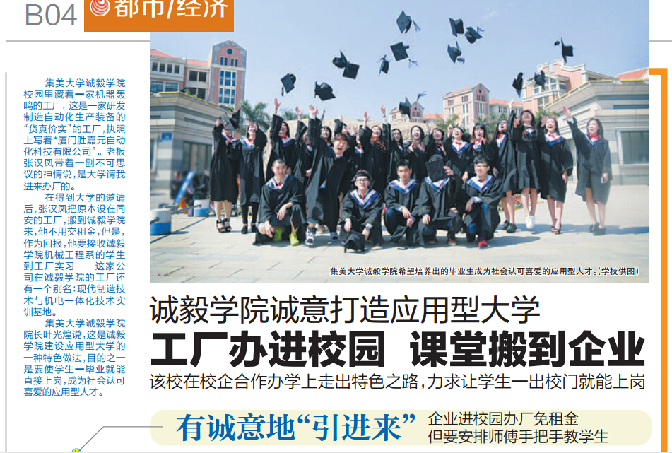 集美大学诚毅学院院长叶光煌说,这是诚毅学院建设应用型大学的一种特色做法,目的之一是要使学生一毕业就能直接上岗,成为社会认可喜爱的应用型人才。