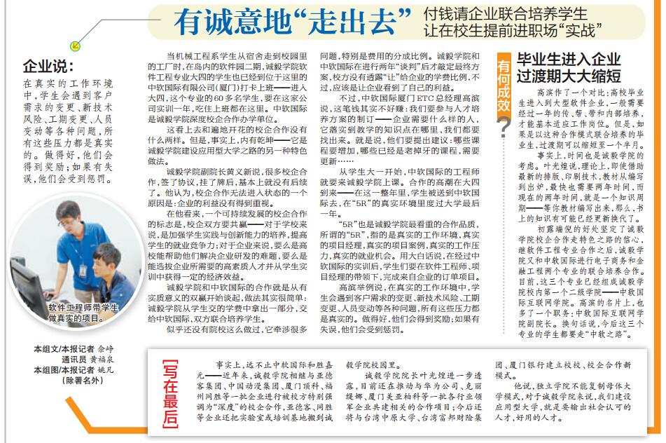 初露端倪的好处坚定了诚毅学院校企合作走特色之路的信心,继软件工程专业合作之后,诚毅学院又和中软国际进行电子商务和金融工程两个专业的联合培养合作。目前,这三个专业已经组成诚毅学院校内第一个二级学院——中软国际互联网学院。高滨的名片上,也多了一个职务:中软国际互联网学院副院长。换句话说,今后这三个专业的学生都要走“中软之路”。