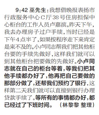 2016年3月3日,忙碌了一天的大厅慢慢清净下来。正在大家收拾东西即将下班的时间,有一对买卖双方急匆匆地赶来过户,原来是他们本以为政务大厅18:00才下班,双方又都是外地人,今天好不容易把时间敲定,加上卖方明天一大早的飞机,如果现在无法受理,势必给买卖双方带来不小的影响。了解到了买卖双方的特殊情况,卢佳滨微笑着说:“您不用着急,我现在就给您办理,我把鉴证窗口需要的材料先准备好,你们就可以先到那个窗口办理相关业务,我也准备一下银行贷款材料,一会再过来拿。”“小卢一边准备过户材料,一边准备担保材料,还要和银行沟通时间。待全部办理好已经是17:30,早错过了下班的班车,他依然微笑耐心”黄女士特别感动说,“通过这件事情,我们不仅感受到了小卢灵活机动,更体会到行政服务中心的优质、高效的服务风范。”