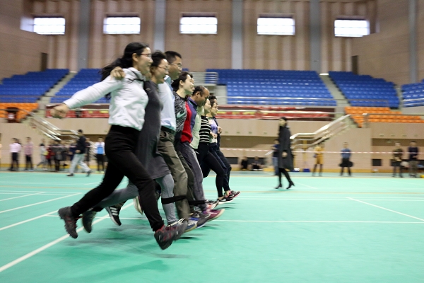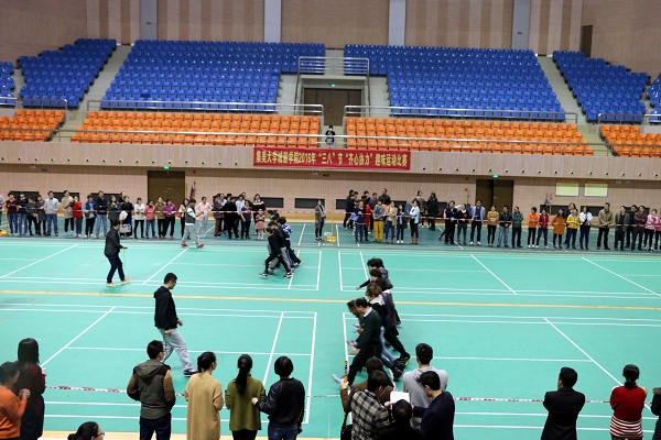 讲座结束后,“齐心协力”趣味比赛在体育馆正式开赛。比赛由公体教学部主任林少琴老师主持,院党委副书记、部门工会主席朱晨光宣布比赛开始。陈立新等公体教学部的老师担任赛事裁判。