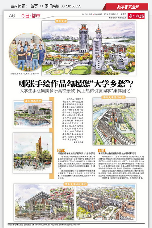 3月25日,《厦门晚报》整版专题报道了集大大四学生陈洪和他朋友何渊等人创作的集美高校校园手绘作品,其中也有诚毅学院多副作品。经过与原作者联系,现转载如下。