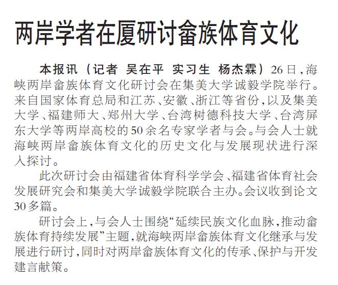 3月26日,福建日报第6版以《两岸学者在厦研讨畲族体育文化记者》为题刊登报道了我院举办的海峡两岸畲族体育文化研讨会,新华网、凤凰网、搜狐网、海西晨报、福建省教育厅官方网站等媒体也进行了转发报道。现全文转发如下: