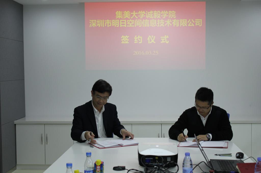 3月25日下午,集美大学校长助理、诚毅学院院长叶光煌一行5人参观考察广东省深圳市明日空间信息技术有限公司。叶光煌院长与林述佳总经理签署《集美大学诚毅学院与深圳市明日空间信息技术有限公司共建动漫工作室合作协议》。深圳市明日空间信息技术有限公司正式成为我院“文化产业专业群”合作单位。