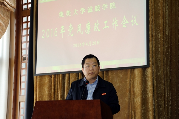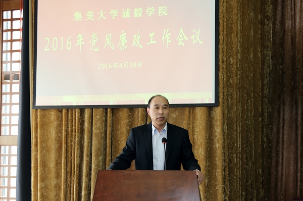 会上,常务副书记朱晨光首先传达了习近平在中纪委十八届六次全会的讲话精神和省纪委九届七次全会、全省教育系统党风廉政建设工作视频会议和集美大学2016年党风廉政建设工作会议精神。其次,他代表院党委作工作报告,回顾总结学院过去一年党风廉政建设的工作情况,并对2016年党风廉政建设工作任务进行了部署。他强调,一要提高认识、进一步增强推进我院党风廉政建设工作的责任感;二要突出重点、进一步加强我院党风廉政建设;三要强化责任担当、推进学院党风廉政建设工作任务的落实。他指出,要做好党纪党规的学习教育,增强责任意识,准确把握责任体系以及一岗双责的要求,巩固党的群众路线和“三严三实”教育成果,锲而不舍落实好八项规定以及党风廉政建设责任制和问责机制,着力营造良好的校园政治生态和育人环境。