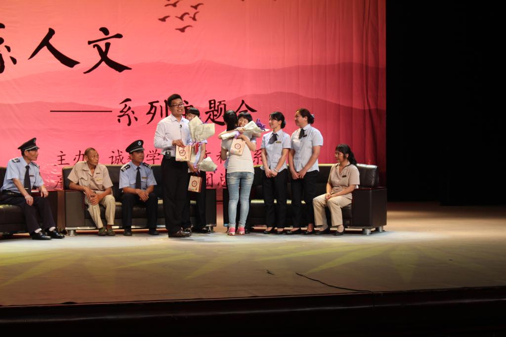 主题晚会在悦耳的旋律中正式开始,全场座无虚席,人文学子们一张张期待的面容,预示着主题晚会的精彩纷呈。开场的人文关怀十年回顾,一张张照片,一声声讲述,瞬间将晚会的气氛带动起来。随之到来的便是原创诗朗诵《从海滨花开到山下春暖》,人文学子动情的朗读,使在座各位感慨万千。人文丹田记录视频之后,丹田物业优秀人物访谈让在坐的各位都湿了眼眶,望着台上身边最熟悉的陌生人——丹田工作者,听着他们质朴的诉说,感动在不经意间注入观众心田,一个个微不足道的故事触动着在场观众,场下已有了不少哽咽声,整场晚会的情绪到达了高潮。