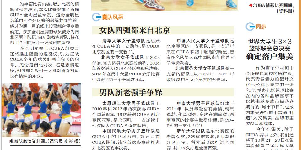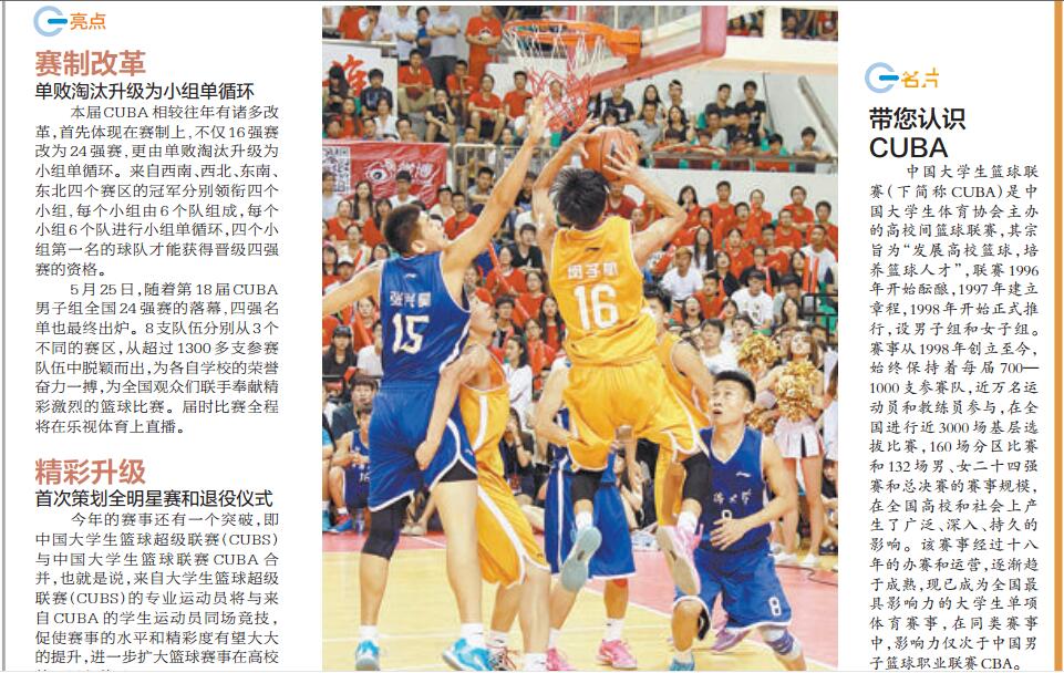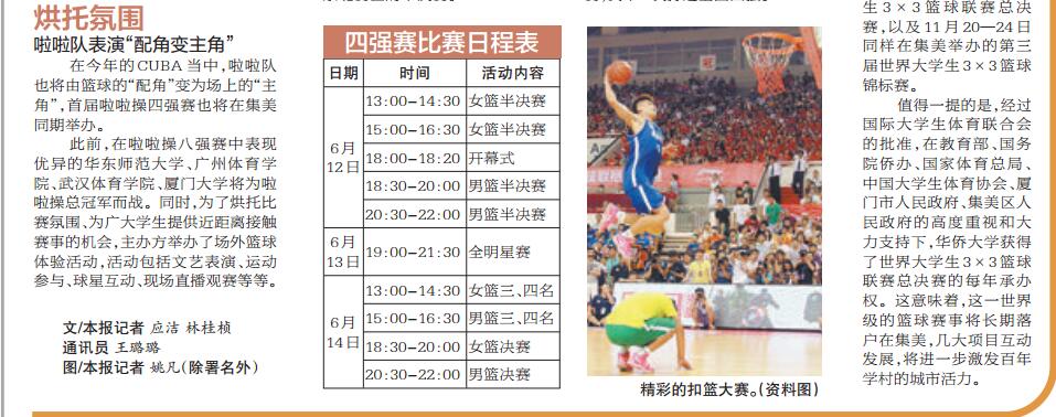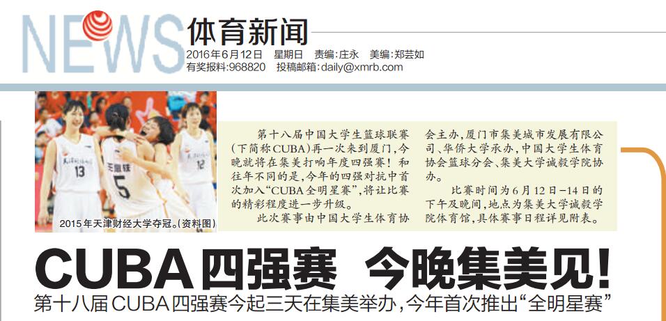 6月12日至14日,第十八届中国大学生篮球联赛(下简称CUBA)将在集美大学诚毅学院体育馆举行,此次赛事由中国大学生体育协会主办,厦门市集美城市发展有限公司、华侨大学承办,中国大学生体育协会篮球分会、集美大学诚毅学院协办。 和往年不同的是,今年的四强对抗中首次加入“CUBA全明星赛”,将让比赛的精彩程度进一步升级。比赛时间为6月12日-14日的下午及晚间,地点为集美大学诚毅学院体育馆,具体赛事日程详见厦门日报报道和附表。现全文转发如下:http://www.xmnn.cn/dzbk/xmrb/20160612/201606/t20160612_4904132.htm