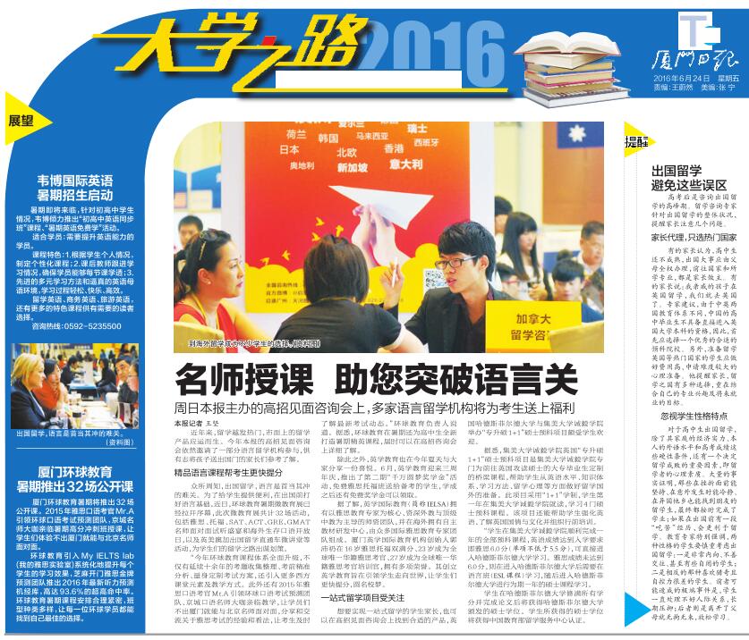 6月24日,厦门日报报道“英国哈德斯菲尔德大学与集美大学诚毅学院举办“专升硕1+1”硕士预科项目”消息,现全文转载如下: