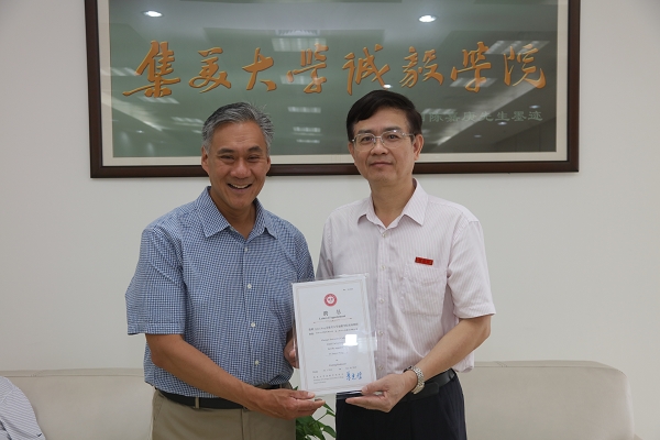 6月30日上午,集美大学诚毅学院举行客座教授聘任仪式,叶光煌院长向美国纽约花旗集团全球通信与公共事业公司副总裁、纽约基金公司高级副总裁、美国康涅狄格州斯坦福德同步金融公司高级CEOSamuel Wang博士颁发聘书,聘任Samuel Wang博士为我院客座教授。