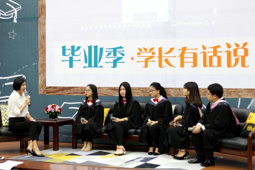 此次访谈由人文科学系2017届优秀毕业生吴蕊主持,邀请中文、法学、英语三个专业2017届优秀毕业生代表陈伊颖、施佳钰、邹景宇、陈梅芳、黄佳琦等五位同学,围绕大学四年的记忆和感悟展开,为在场的500余名学弟学妹们带来一场精彩的、励志的视听盛宴。