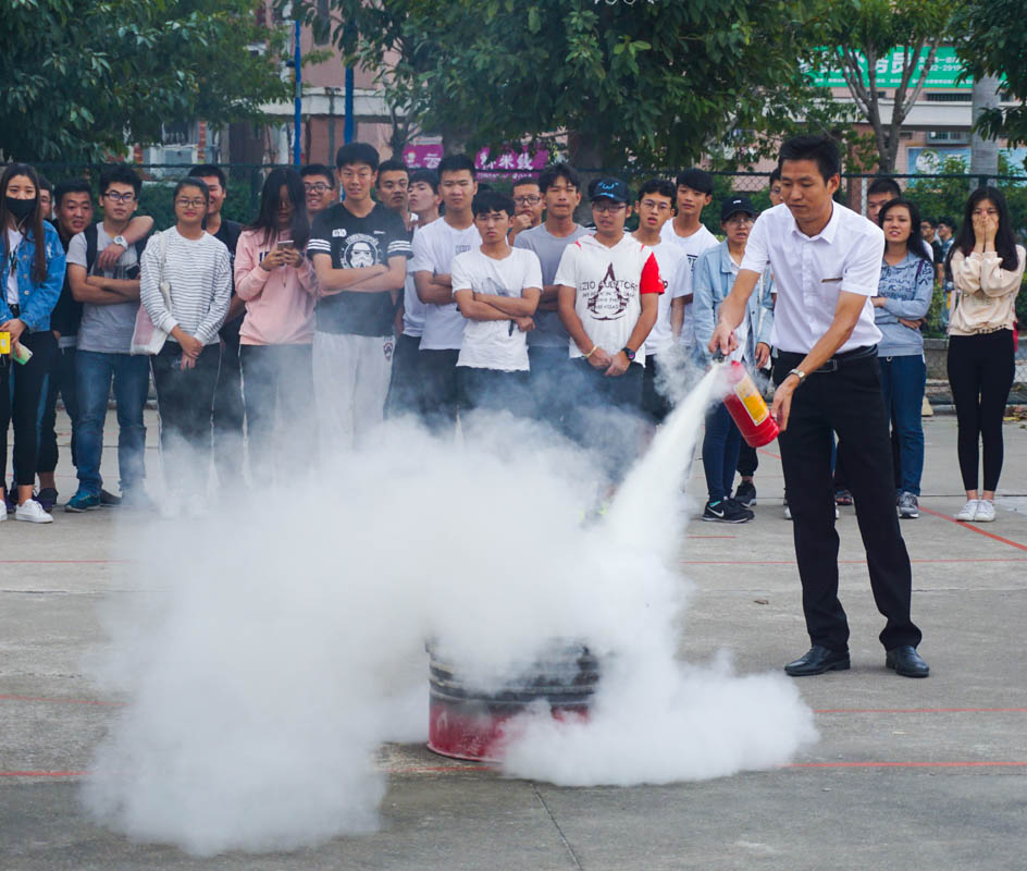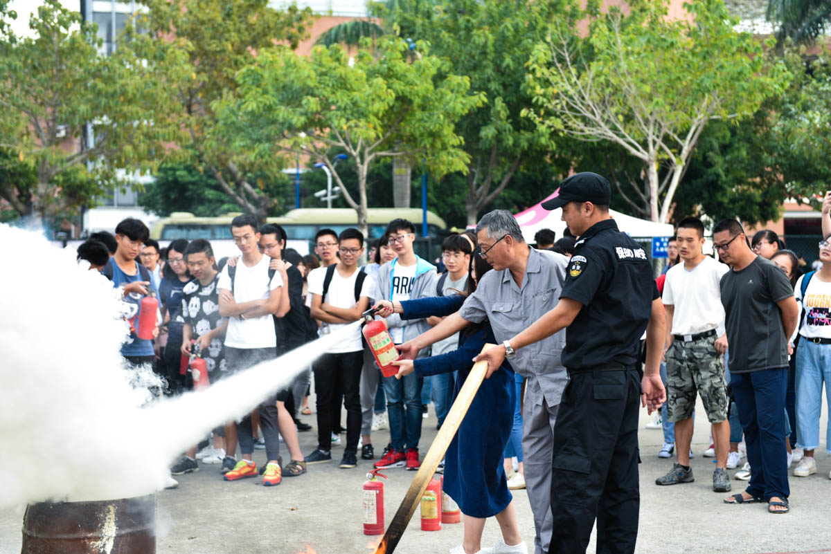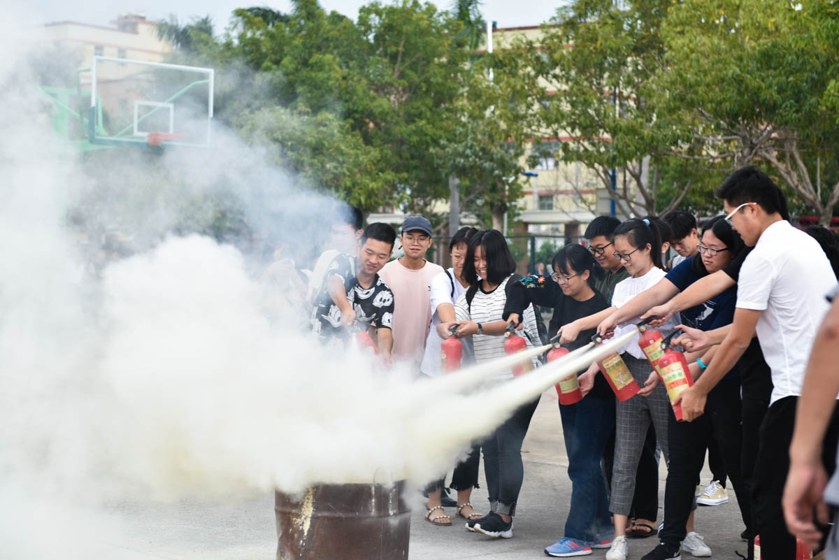 紧接着,师生们来到篮球场参加灭火演练。在集美消防中队官兵讲授怎样扑救初起火灾、怎样正确报警和自救逃生、怎样使用灭火器材等消防安全基本常识后,参加演练的师生们观摩了消防教官灭火器的使用演示,并在消防教官指导下分四个方阵展开灭火实战演练。