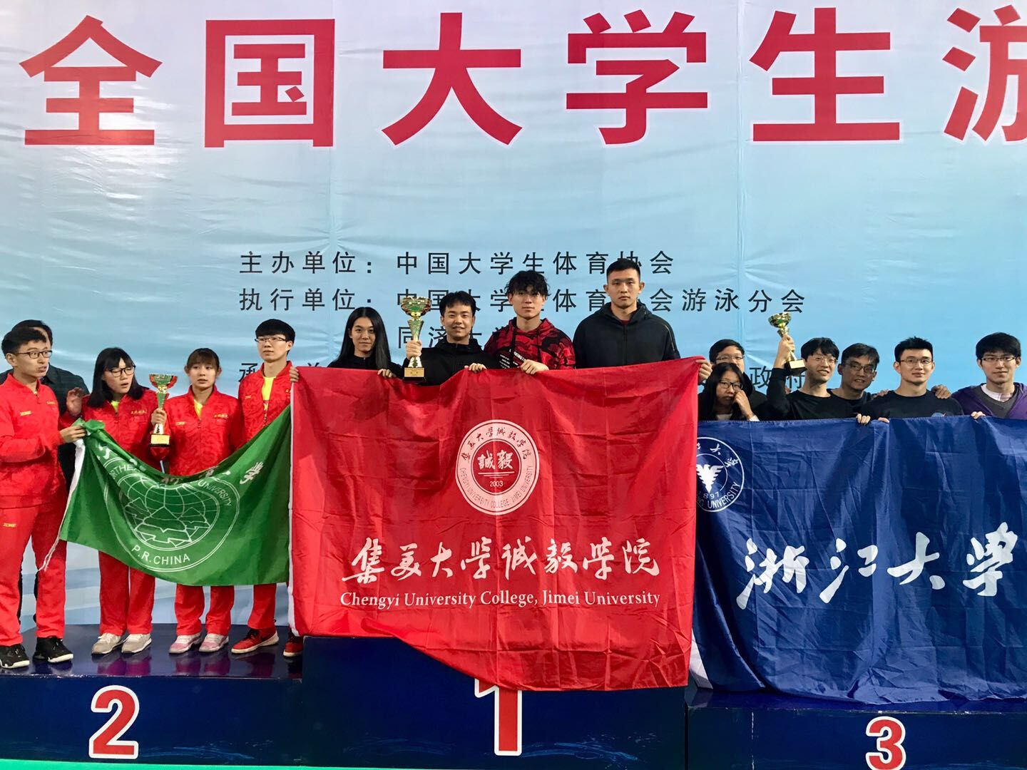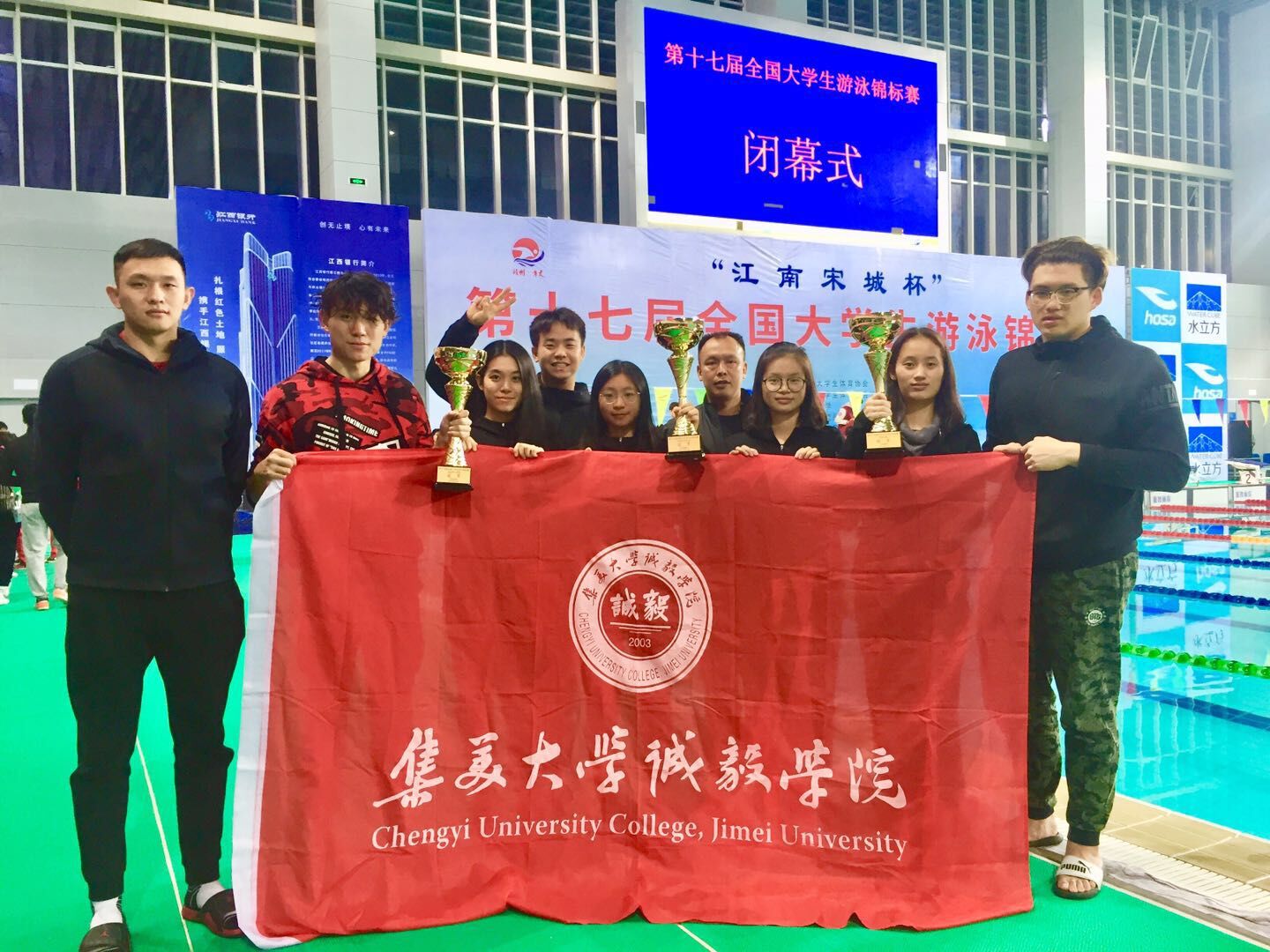 11月18日至22日,第十七届全国大学生游泳锦标赛在江西赣州举行,22日晚,比赛举行颁奖暨闭幕式,集美大学诚毅学院游泳队在比赛中团结协作,努力拼搏,最终获得丙组男子团体、女子团体和团体总分第一名,这不仅是诚毅游泳队有史以来的最好成绩,也是全国大学生游泳锦标赛中唯一一次同时包揽所有三项团体冠军的突破性成绩!