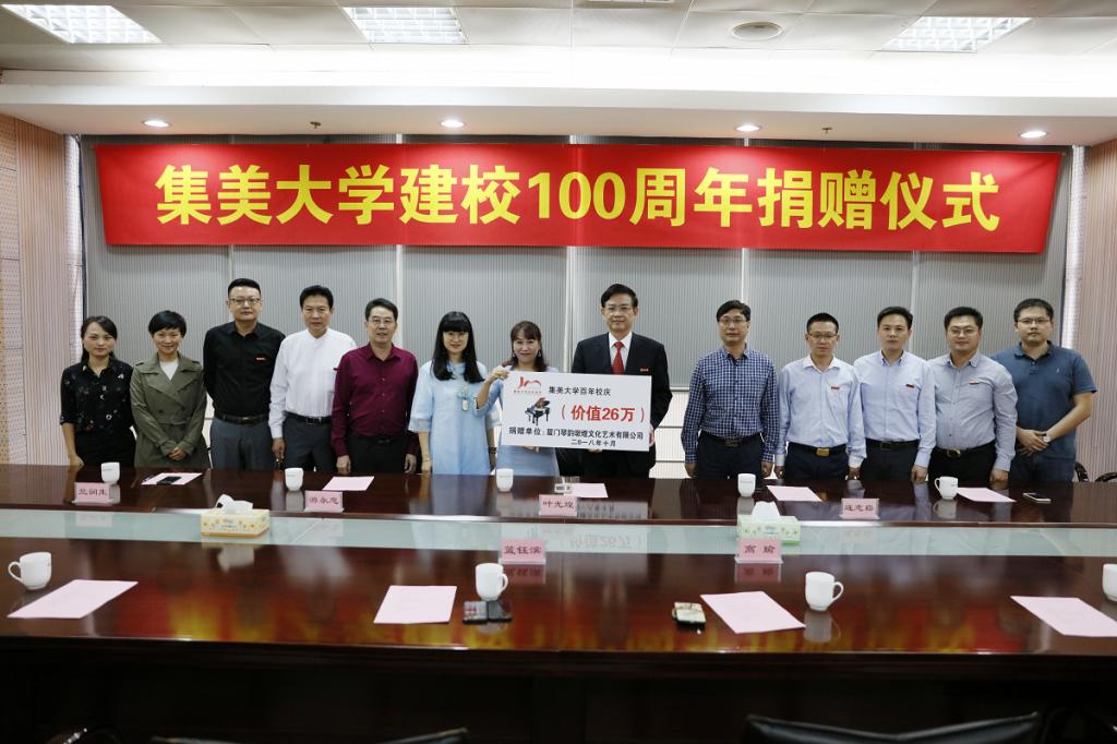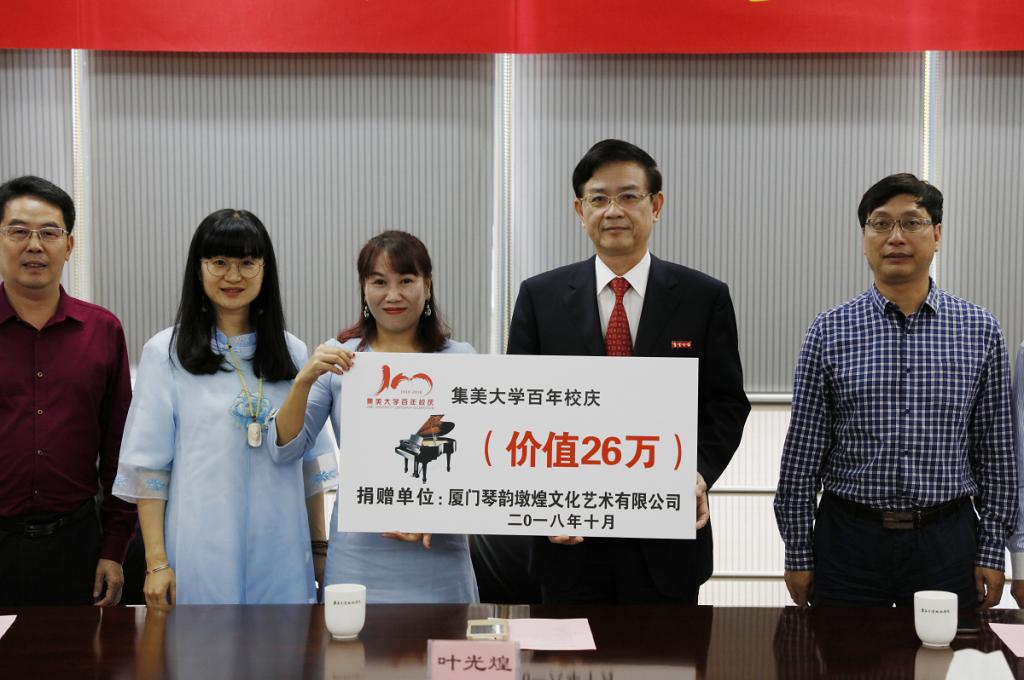 10月18日下午,在集美大学建校100周年、诚毅学院建院15周年之际,厦门琴韵墩煌文化艺术有限公司向诚毅学院捐赠价值26万元三角钢琴一台。福建集美大学教育发展基金会理事长、诚毅学院院长叶光煌,院党委副书记连志崧,工会主席兼院办主任游永忠,厦门琴韵墩煌文化艺术有限公司总经理蓝钰滨(音乐学院99级校友),厦门琴韵墩煌文化艺术有限公司总监高瑜(音乐学院99级校友),我院体育与艺术系相关负责人及音乐舞蹈教研室教师代表参加捐赠仪式。