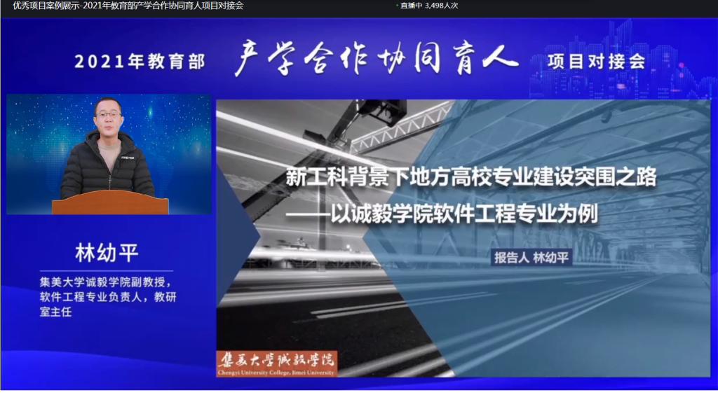 大会设置平行分论坛——优秀项目展示会场,我院林幼平老师受邀作为对接会嘉宾,做《新工科背景下地方高校专业建设突围之路——以集美大学诚毅学院软件工程专业为例》报告。报告从新工科新要求、学院简介、突围之路、难点短板、保障措施、阶段成果六个方面,向与会领导专家全面汇报了我院软件工程专业的建设情况,获得较好反响。