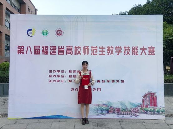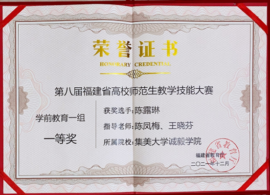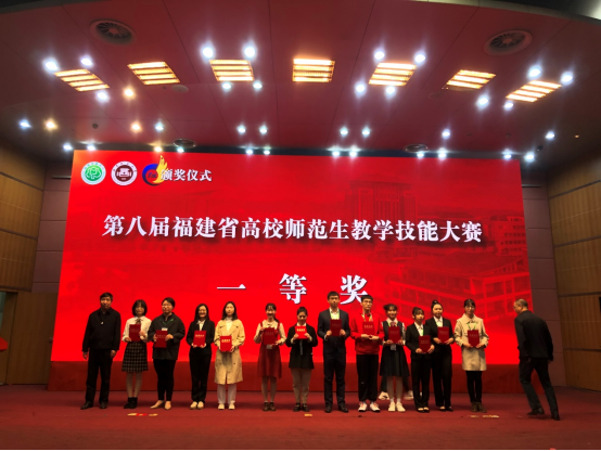 12月10日至12日,第八届福建省高校师范生教学技能大赛在福建师范大学旗山校区举行。我院体育与艺术系2018级学前教育专业学生陈露琳同学以小组第一名的成绩喜获学前教育组一等奖;指导老师陈凤梅获“优秀指导教师”。