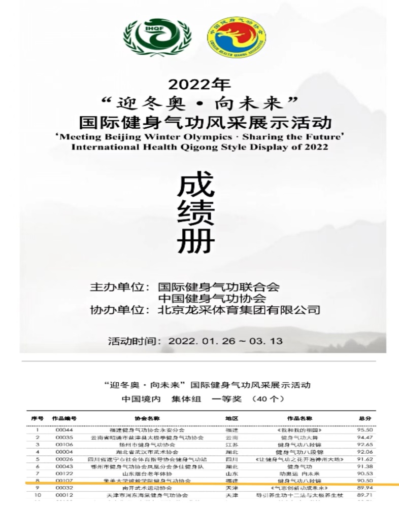 近日,在2022年“迎冬奥·向未来”国际健身气功风采展示活动中,我院陈丹老师带领的健身气功队,在集体组别中以作品集体八段锦,获得总分90.50分的高分,排名第8,荣获一等奖。健身气功队所展示的动作舒展柔和、圆活连贯、势势到位,深受专家组好评,在国际健身气功交流的平台上充分展示了我院师生良好的精神风貌。