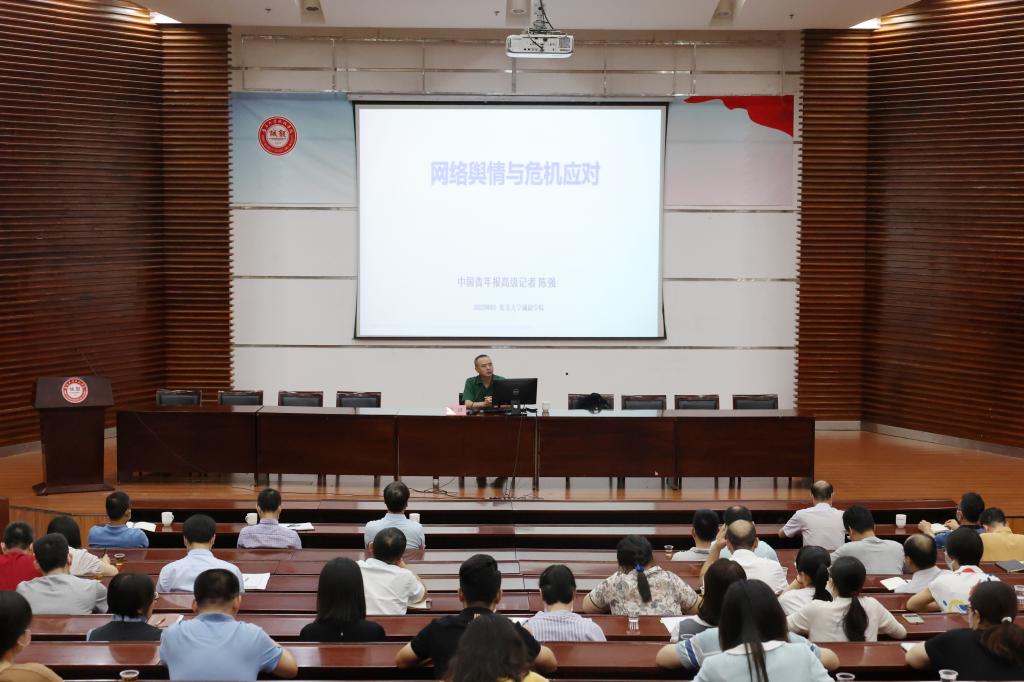为深入学习贯彻习近平总书记关于宣传思想工作的重要思想,严格落实意识形态工作责任制,进一步提升我院党员领导干部媒介素养和舆情处置能力,6月1日上午,我院举办党委理论学习中心组(扩大)学习会暨意识形态工作专题报告会,《中国青年报》高级记者陈强应邀作题为《网络舆情与危机应对》专题报告。院党委理论学习中心组成员、全院助理级以上干部、全体辅导员参加此次报告会,报告会由党委宣传部部长林伟毅主持。