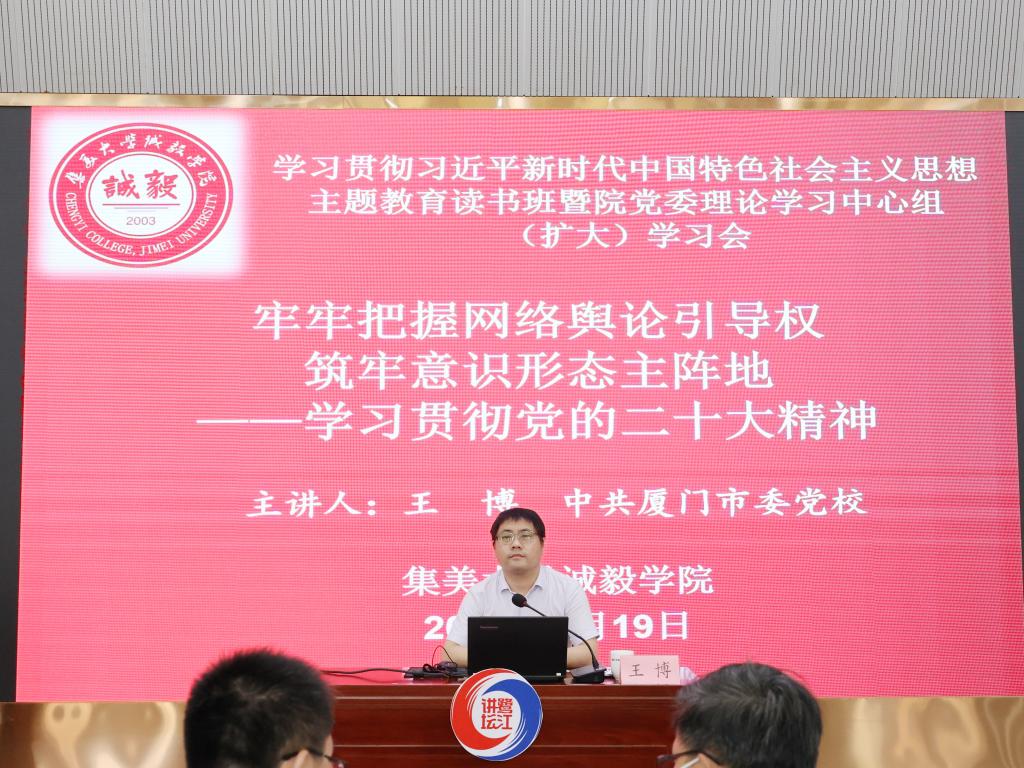 5月19日下午,我院举办学习贯彻习近平新时代中国特色社会主义思想主题教育读书班暨党委理论学习中心组(扩大)学习会,开展宣传思想工作(意识形态工作)专题学习,中共厦门市委党校副教授王博应邀做《牢牢把握网络舆论引导权筑牢意识形态阵地——学习贯彻党的二十大精神》专题报告。院党委理论学习中心组成员、助理级以上干部、全体辅导员参加读书班学习。学习会由党委宣传部部长林伟毅主持。