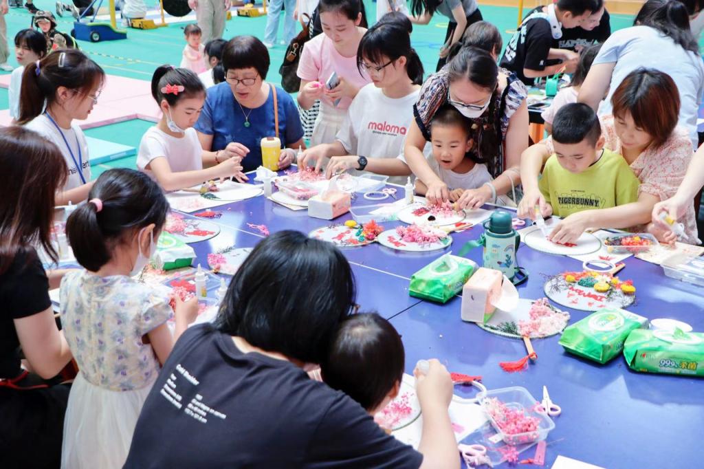 活动在体育与艺术系学前教育专业学生生动活泼的开场舞表演《大梦想家》中拉开帷幕,亲子热身操GGbond后,游戏正式开始。场地内,200多名学前教育专业的志愿者分别指导各组家庭在不同的游戏区内开展保龄球、踩高跷、亲子跳跳跳、真人飞行棋等23个游戏项目,不同年龄段的小朋友都能在其中找到属于自己的游戏,沉浸式体验,孩子们天真的笑脸,活泼的身影,是属于童年最弥足珍贵的靓丽色彩。除了游戏区热火朝天的玩耍场面外,在“小剧场”里,有《机智的小猪生活》《小黑鱼》《你看起来好像很好吃》《小青虫的梦》等四部绘本剧,吸引了一波波“热心观众”到场观看,现场一座难求,演出火爆;在手工制作区,有扇子、花篮等手工制作体验,大、小朋友围坐一起,共同享受一起创作的乐趣和亲子时光;在作品展示区,有学前教育专业学生的手工创作作品和绘画展,也成为了大家最喜欢的“网红打卡点”,纷纷驻足观看并拍照留念。体育与艺术系嘉音合唱团带来的快闪《稻香》《孤勇者》将整场活动推向了高潮,动听而熟悉的旋律深得小朋友们喜爱,赢得了现场热烈的掌声。游戏后,每个到场的小朋友都可以凭借集齐的游园印章,兑换自己心仪的礼品,满载而归。教工们纷纷表示,期待已久的亲子校园活动又回来了,希望以后每年都能相聚校园,让诚毅和自己一起见证孩子的成长。