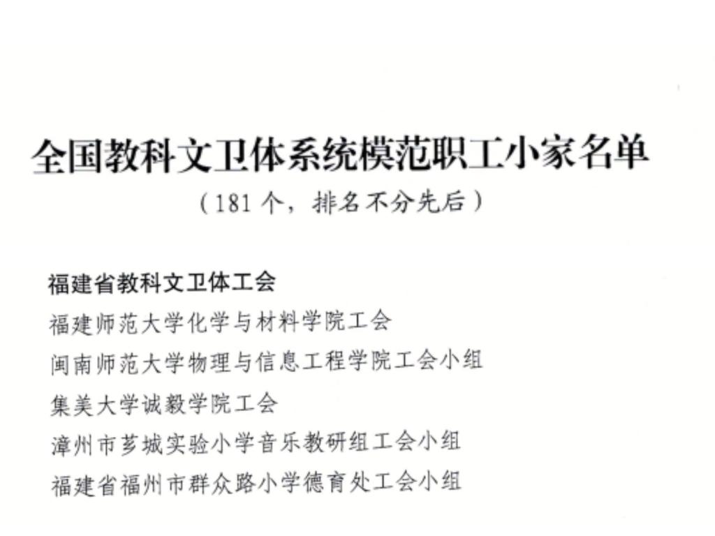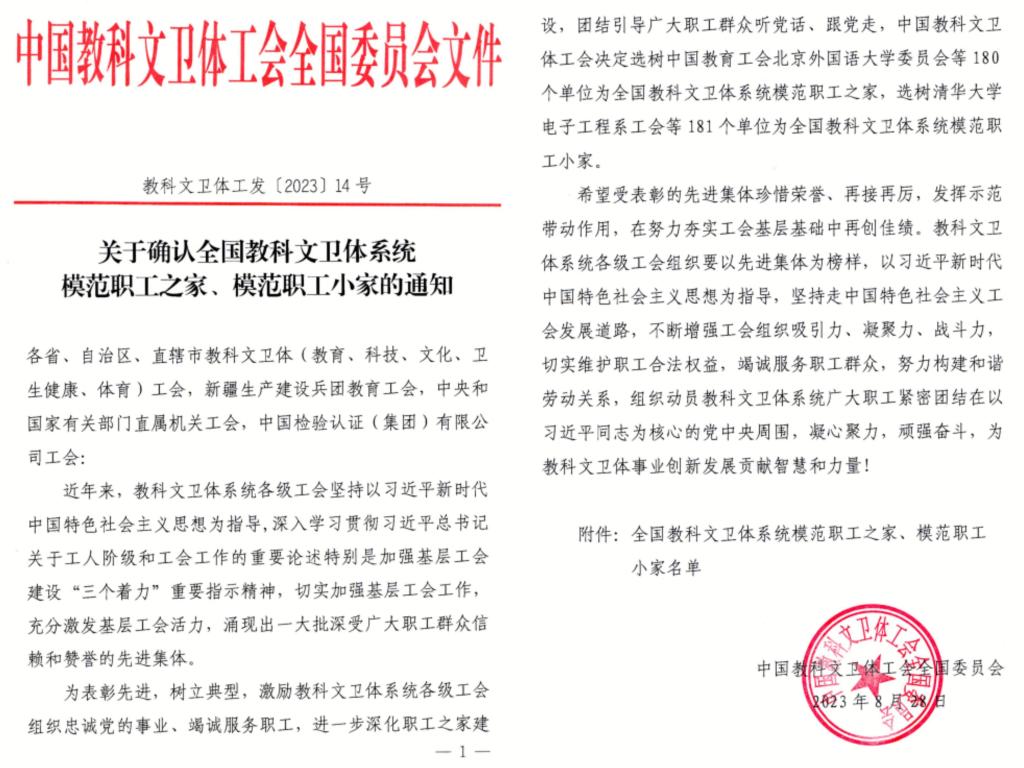 8月28日,中国教科文卫体工会全国委员会公布《关于确定全国教科文卫体系统模范职工之家、模范职工小家的通知》。我院部门工会获全国教科文卫体系统“模范职工小家”荣誉称号。