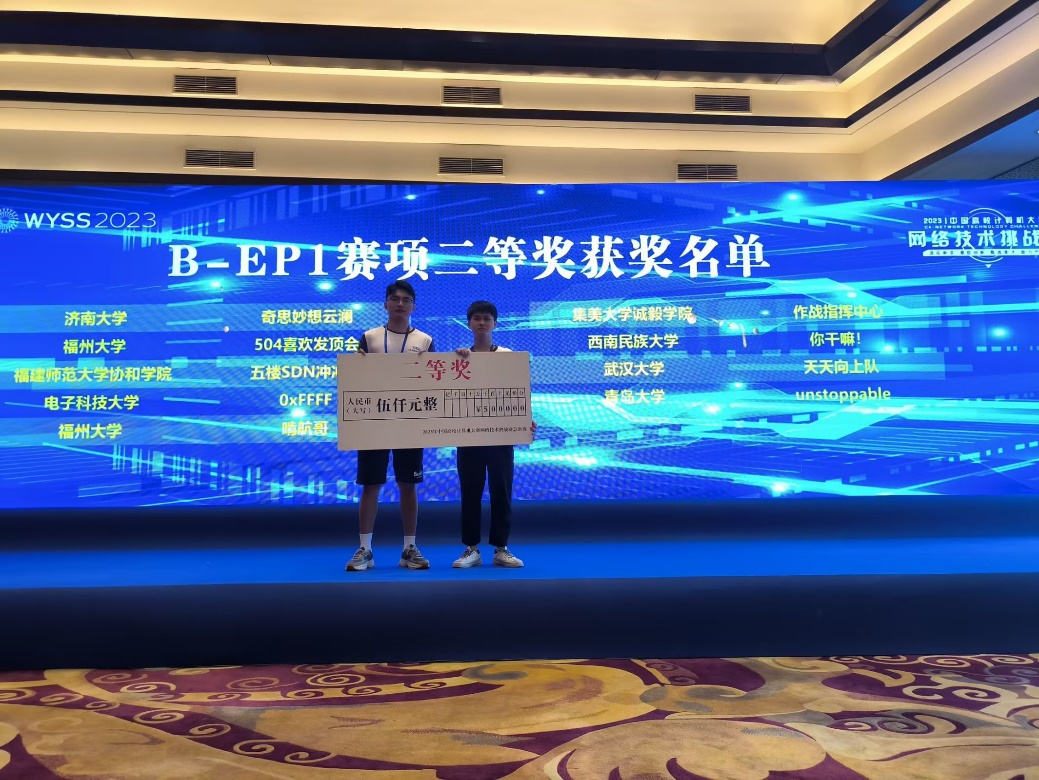 9月8日,第八届“中国高校计算机大赛——网络技术挑战赛”决赛答辩评审在温州大学举行,来自全国的133支队伍分别在五大赛道开展了紧张激烈的角逐。我院信息工程系和中软国际互联网学院的吴文昕、林松、洪庭晖、刘俊杰、张柳旭等5位同学组成的参赛队伍,在杨远奇、唐基宏两位老师的指导下,荣获网络技术挑战赛B-EP1赛项全国总决赛二等奖,杨远奇获评“优秀指导教师”,取得我院在该项赛事上的突破性成绩。