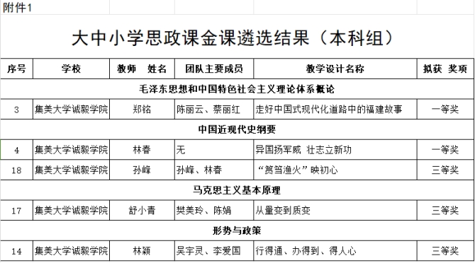 近日,福建省教育厅公布了大中小学思政课金课遴选结果,我院喜获一等奖两项,三等奖三项。其中,郑铭老师的《走好中国式现代化道路中的福建故事》和林春老师的《异国扬军威壮志立新功》获一等奖;孙峰老师的《“筼筜渔火”映初心》、舒小青老师的《从量变到质变》和林颖老师的《行得通、办得到、得人心》获三等奖。