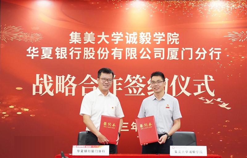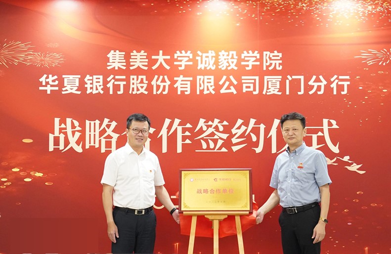 现场,姚进忠与张志勤签订了战略合作协议,同时双方进行了“战略合作单位”揭牌仪式。此外,学院诚挚邀请华夏银行厦门分行参加学院办学20周年的庆典活动。此次签约,标志着双方合作开启崭新的篇章,双方将不断深入,加强共建交流,促进共同发展。
