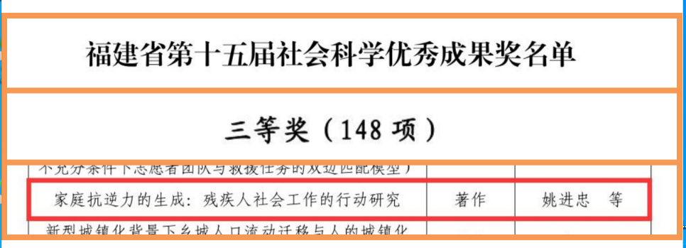 日前,福建省人民政府发布了《关于颁发福建省第十五届社会科学优秀成果奖的决定》。我院院长姚进忠教授的专著《家庭抗逆力的生成:残疾人社会工作的行动研究》荣获三等奖。该专著是姚进忠教授主持的国家社会科学基金青年项目“残疾人家庭抗逆力生成机制的社会工作研究”(编号:16CSH065)的结项成果。