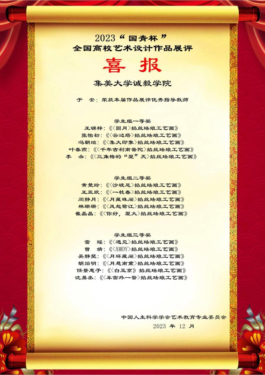 近日,第七届“国青杯”全国高校艺术设计大赛圆满结束,我院人文科学系学子凭借出色的作品和新颖的创意,斩获学生组一等奖5项、二等奖5项、三等奖6项,于安老师荣获本届作品展评优秀指导教师奖。