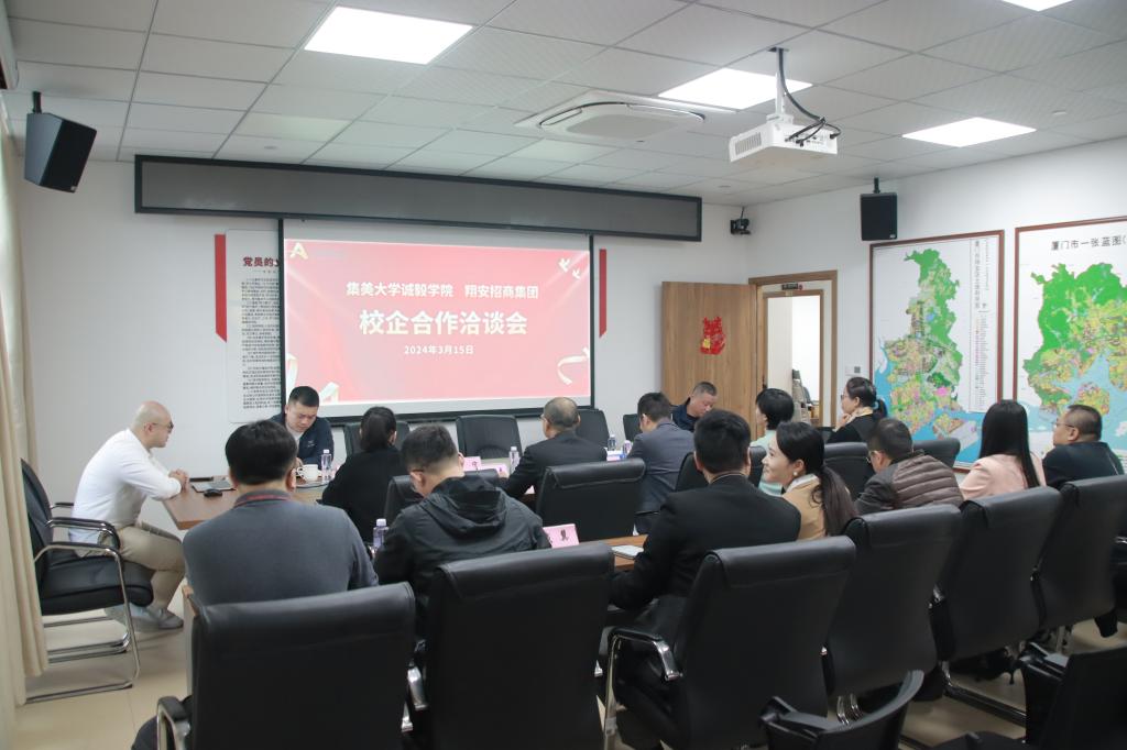 为进一步加强校企合作,促进产教深度融合,推动人才培养质量,3月15日,学院党委副书记、院长姚进忠教授携科研促进部、体育与艺术系、数学与数字科学系相关负责人一行参访厦门市翔安招商集团有限公司,开展校企合作交流研讨洽谈会。厦门市翔安招商集团有限公司总经理纪俊欣,副总经理袁诚、肖宁及相关中层领导参加会议,同时特邀哈尔滨工业大学大数据公司总经理黄思颖、翔发人才公司总经理洪汉参与座谈。