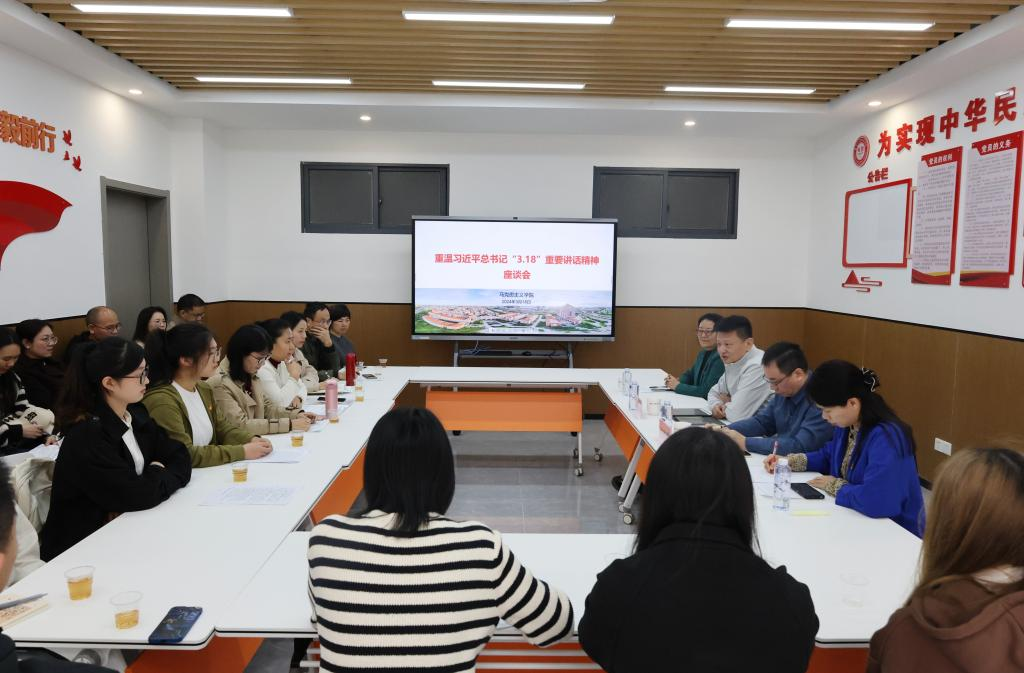 3月18日,我院在“一站式”学生社区党团活动室召开重温习近平总书记“3.18”重要讲话精神座谈会,重温习近平总书记在学校思想政治理论课教师座谈会上的重要讲话精神。院党委书记罗钫、马克思主义学院全体教师,诚毅读书社、青马俱乐部和“诚毅童行”实践队等学生代表参加了座谈会,会议由党委宣传部部长林伟毅主持。