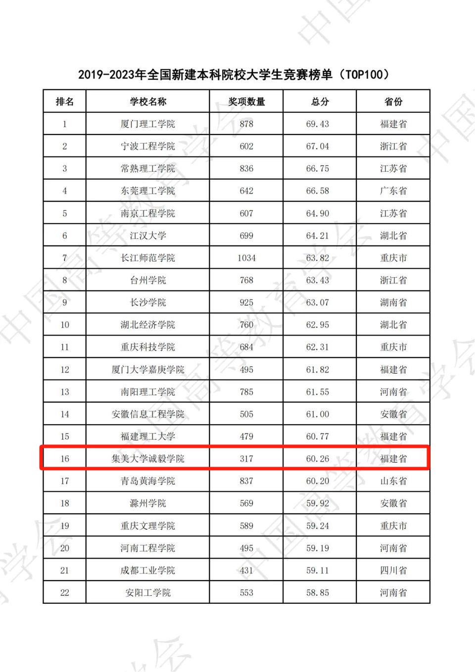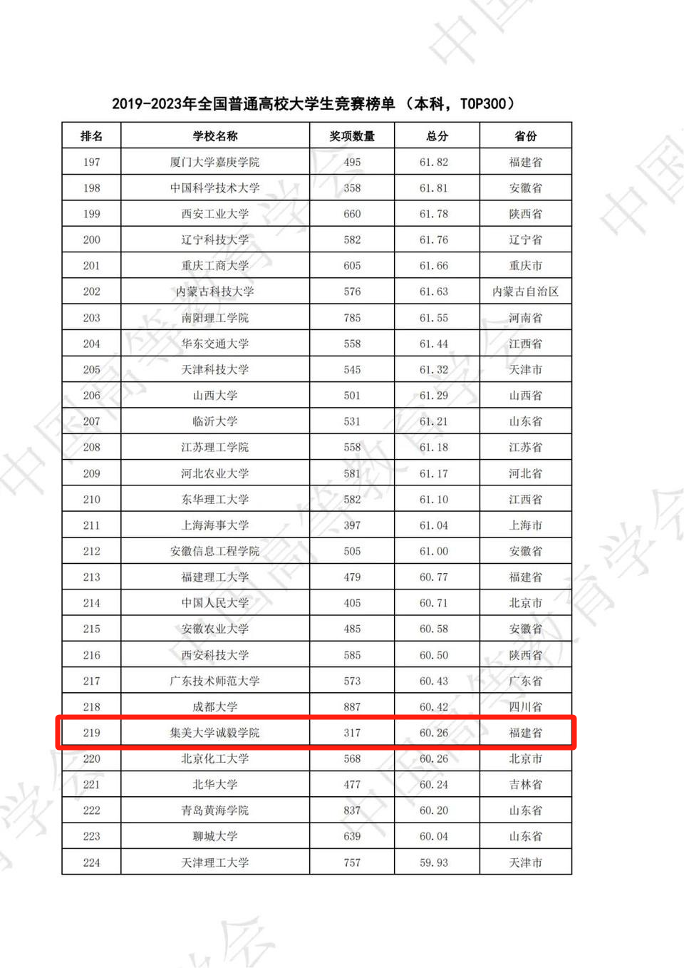 3月22日,中国高等教育学会发布《2023全国普通高校大学生竞赛分析报告》,在《2019-2023年全国普通高校大学生竞赛榜单(本科,前300)》中,学院以获奖数317项位居第219名,比上一轮榜单前进25名,该成绩继续蝉联福建省本科高校第10名、全国民办院校(含独立学院)榜单第3名。在《2019-2023年全国新建本科院校大学生竞赛榜单(Top100)》中,学院位居第16名,比上一轮榜单前进5名。2023年,诚毅学院在大学生学科竞赛中斩获国家级奖项数首次破百,达到126项,比2022年同期增长44.83%,并在多项指标取得新突破,优异的成绩是全体诚毅师生通力协作、奋勇拼搏的结晶,也向外界展示了诚毅参赛学子的风采。