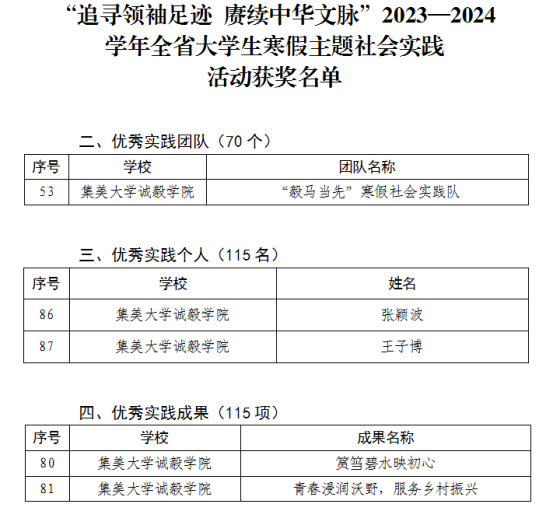 近日,中共福建省委教育工委公布“追寻领袖足迹 赓续中华文脉”2023—2024学年全省大学生寒假主题社会实践活动获奖名单。我院“毅马当先”寒假社会实践队获评优秀实践团队,院团委张颖波老师、2021级法学专业学生王子博获评优秀实践个人,“诚毅读书社”实践队微视频作品《筼筜碧水映初心》、“诚毅童行”实践队微视频作品《青春浸润沃野,服务乡村振兴》荣获优秀实践成果奖。